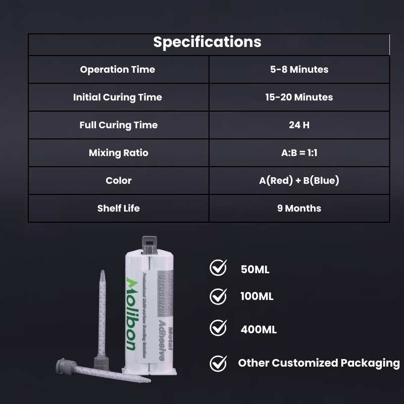Ideal para unir componentes de metal e plástico de engenharia em equipamentos mecânicos, o adesivo metálico industrialProporciona alta resistência estrutural e desempenho confiável a longo prazo sob impacto e estresse térmico.