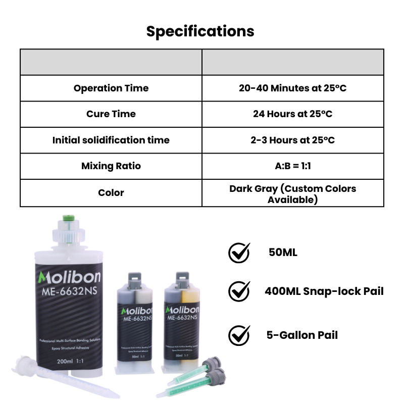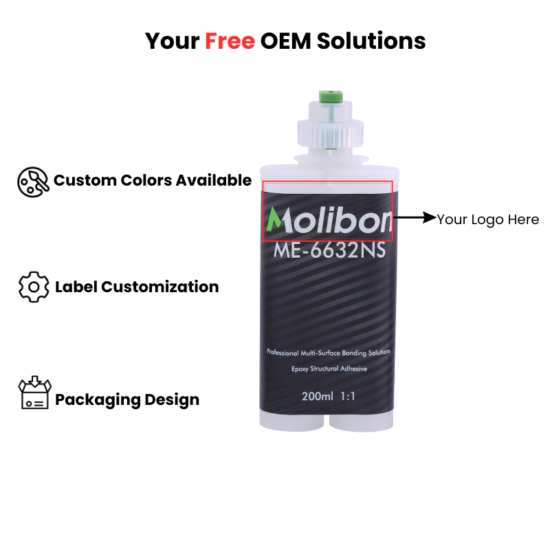 A Molibon oferece adesivo de colagem epóxi Em baldes padrão de 50 ml e 400 ml com fecho hermético ou em baldes de 5 galões. Tanto a cor (preto/branco padrão) quanto a embalagem podem ser personalizadas.